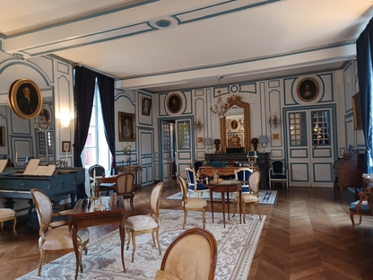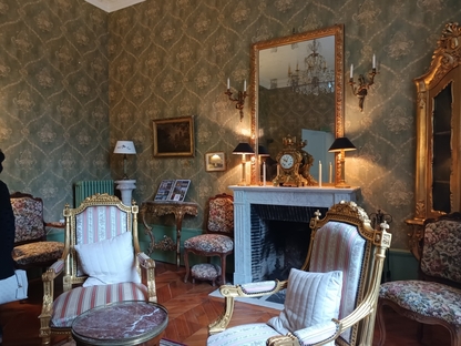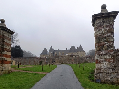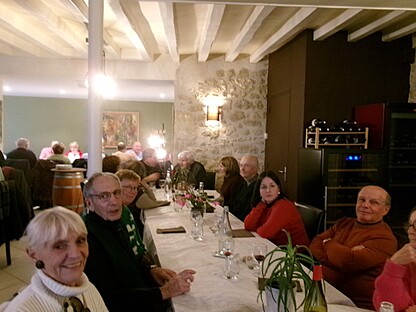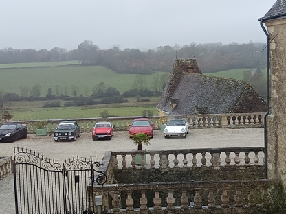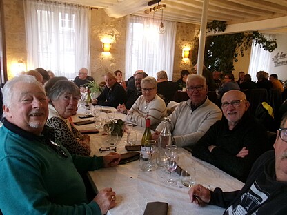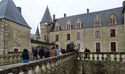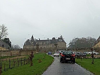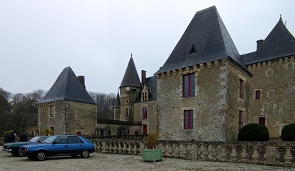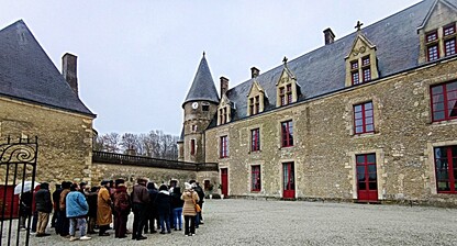 très maussade, avec 76 adhérents et amis. Nous continuons notre périple en faisant la route du "circuit des manoirs et traditions" direction La Chapelle-Souëf pour la visite du château des Feugerets. Toujours sous une pluei battante, deux guides nous accueillent. La manoir fut bâti au début du XVIe siècle par Jean, Seigneur des Feugerets (nom de la plante qui poussait en abondance sur le site à cette époque (fougère) et devient château au XVIIIe avec 8 tours et 1 donjon cerclé par des douves. Il est tenu pendant 800 ans par la même famille. En 2018, il est acheté vide et à l'état d'origine par la famille Xavier FAUTRELLE de FONDAUMIERE qui le restaure et l'ouvre au public d'avril à décembre.